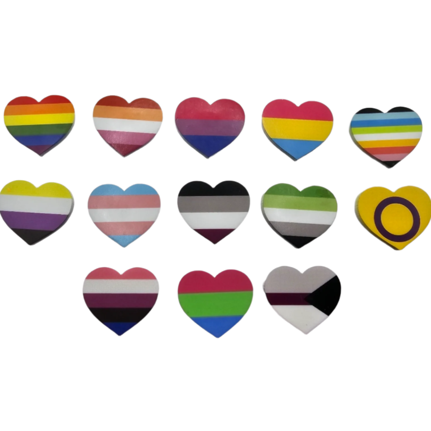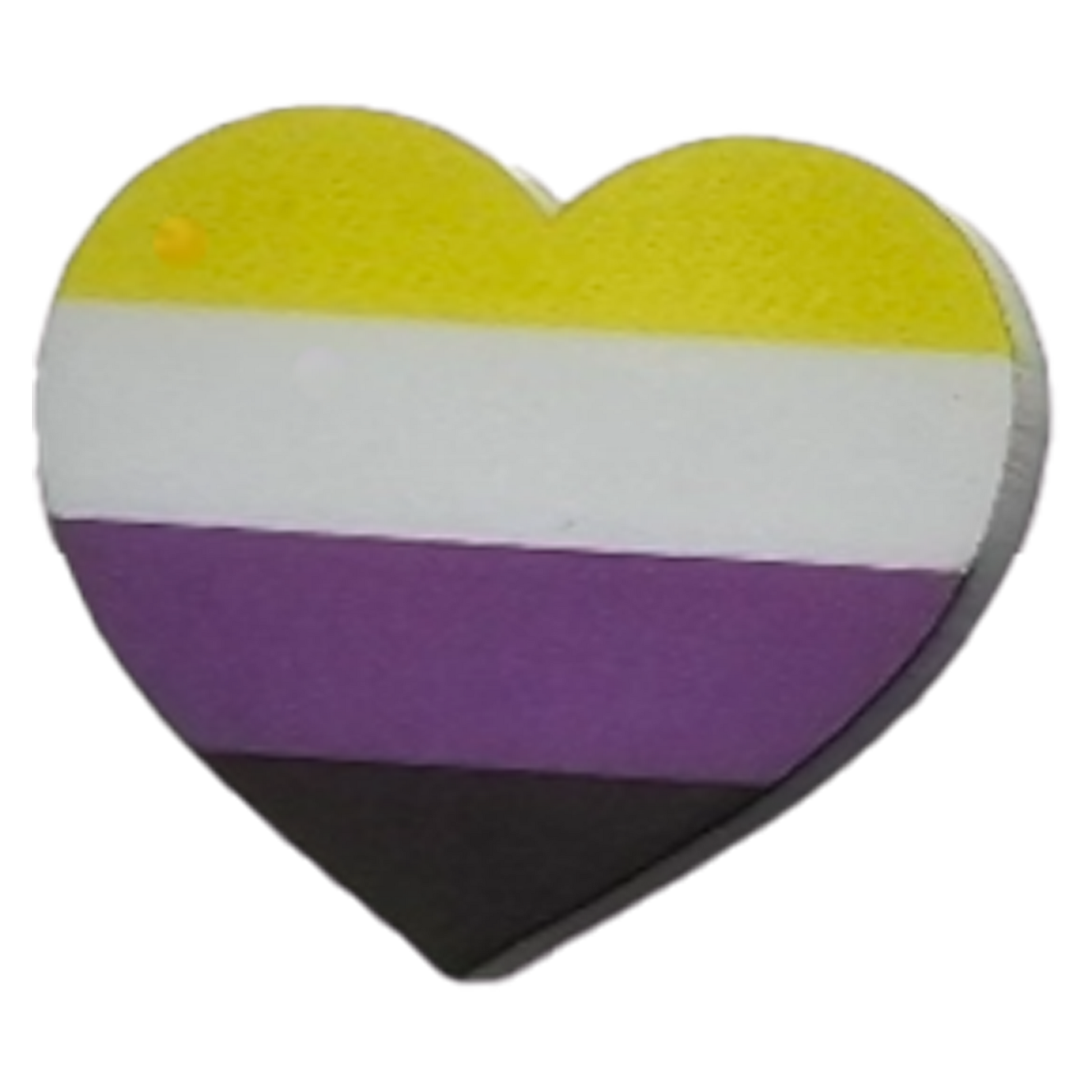 Small pride flag pins with a semi-matte finish. Approximately 1 inch long and 1.2 inch wide.